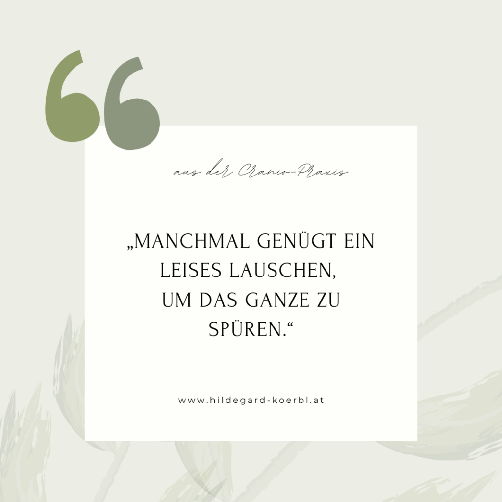 ist die Königin der Craniosacralarbeit. Sie drückt sich in Kräften und Rhythmen aus, die sich neben dem klassischen craniosacralen Rhythmus zeigen. Diese werden von mir mit geschulter Berührung und achtsamer Präsenz in all deinen Gewebestrukturen, Knochen, Faszien und Flüssigkeiten wahrgenommen, begleitet und sanft geleitet. Dein Körper wird ruhiger, gelassener, weicher und weiter. Durch diese neu gewonnene innere Weite beruhigt sich dein Nervensystem, körpereigene Ressourcen treten in den Vordergrund und heilsame Prozesse werden aktiviert. Mehr dazu …